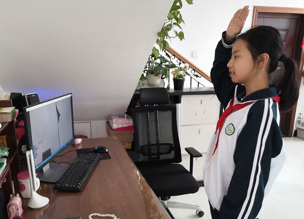 “升國旗、奏唱國歌,敬禮”,鮮艷的五星紅旗冉冉升起,奮發(fā)的少先隊(duì)員們敬著標(biāo)準(zhǔn)的隊(duì)禮,鏗鏘的國歌奏響在全校師生家里,滾燙的愛國之情在每一位心中升騰.......這一刻,我們雖身處不同地方,但我們都懷揣著一顆熾熱的赤子之心,共同祈愿能早日回歸等待了我們?cè)S久的校園!
