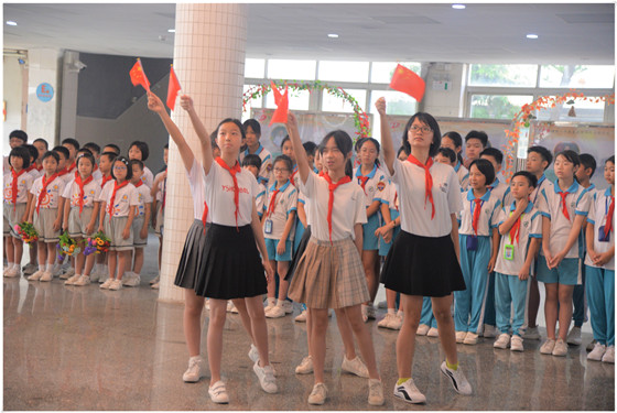 上午7點(diǎn),師生齊聚學(xué)校大堂。一首《沒有共產(chǎn)黨就沒有新中國》助熱現(xiàn)場氣氛。老師領(lǐng)唱,學(xué)生跟唱,全場齊唱。昂揚(yáng)的旋律、蓬勃的精神、自信的擊掌,詮釋著這首歌曲的時代精神。