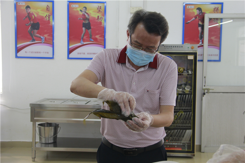 隨后,空課的老師們陸續(xù)到達(dá)學(xué)校飯?zhí)瞄_(kāi)始包粽子。有經(jīng)驗(yàn)的老師將糯米、豬肉等材料在粽葉中填滿(mǎn)扎牢;沒(méi)有包粽子經(jīng)驗(yàn)的老師,在同事的幫助下,現(xiàn)場(chǎng)邊看邊學(xué),踐行操作,直至熟練掌握包粽技巧。
