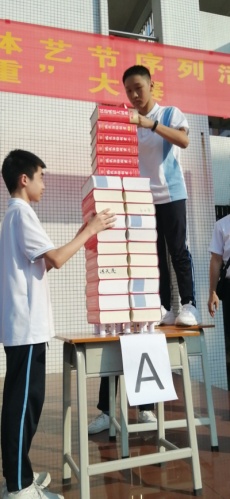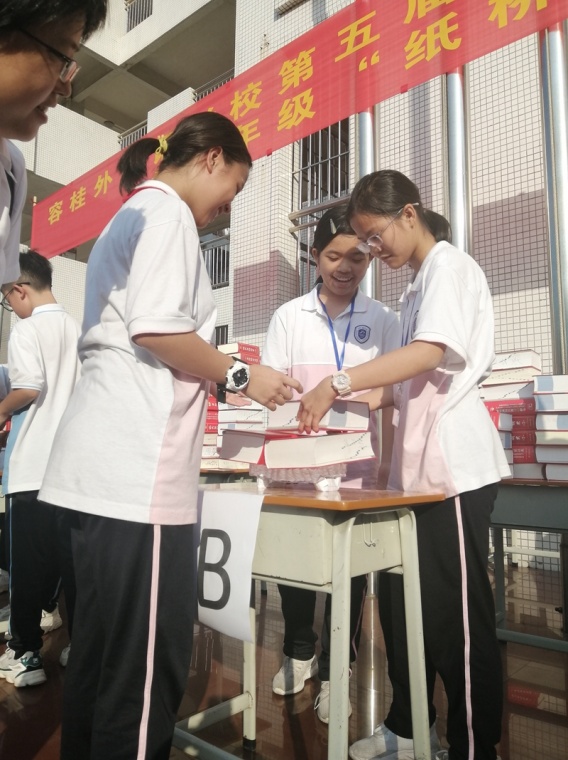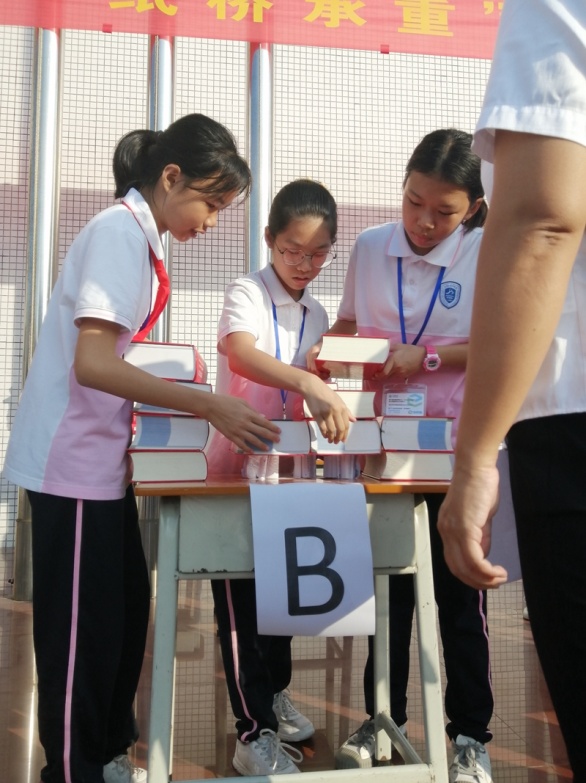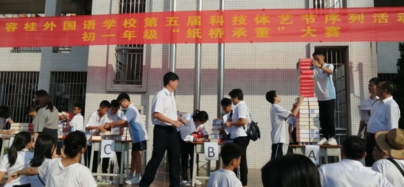 原來現(xiàn)場正在舉行容桂外國語學(xué)校第五屆科技節(jié)系列活動之初一年級“紙橋承重”大賽。