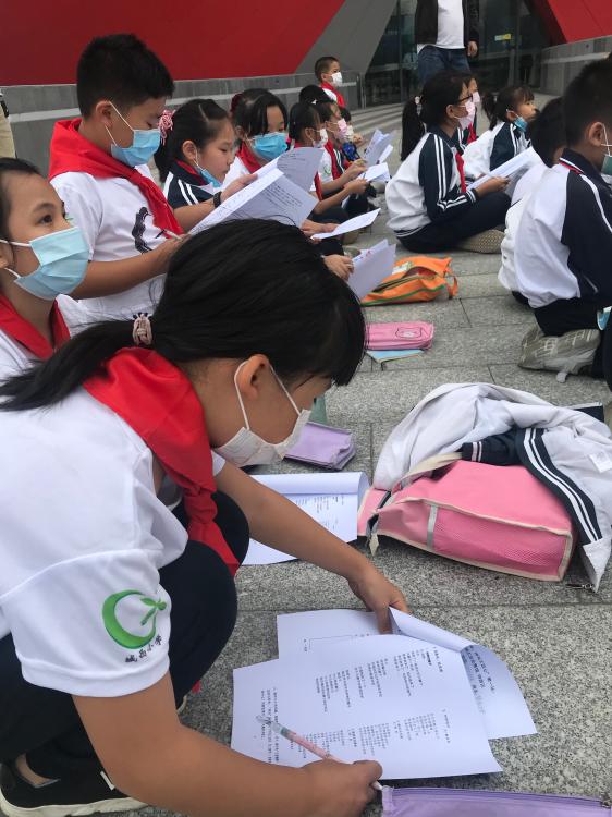 秋天的陽光活潑又溫柔,學(xué)生們熱情高漲、步履輕快,下午2:30四個(gè)學(xué)校的參與同學(xué)在工業(yè)館門口集結(jié)完畢?;顒?dòng)先由小黃圃小學(xué)的張德林主任做一個(gè)關(guān)于工業(yè)發(fā)展館的簡單介紹,學(xué)生們在工業(yè)館門口就地而坐,聽得津津有味。接著容邊小學(xué)童詩教研部主任梁秀玲老師給學(xué)生發(fā)學(xué)習(xí)單,并指導(dǎo)學(xué)生觀察工業(yè)發(fā)展館的外觀,讓學(xué)生根據(jù)觀察所得捕捉好靈感并做好記錄。