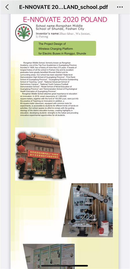 2020年7月6日-8日,受新冠疫情影響,全球首創(chuàng)的虛擬創(chuàng)新博覽會――波蘭“E-NNOVATE”2020在虛擬展臺上盛大開啟,通過在虛擬展臺上展示參加者的創(chuàng)新發(fā)明作品,并進(jìn)行網(wǎng)上評審及給予公眾投票,讓世界各地的發(fā)明界朋友一起分享。 我校趙發(fā)寶、李富榮、吳靖賢等三位同學(xué)的創(chuàng)新參賽作品《順德容桂電動公交車無線充電站臺設(shè)計方案》斬獲“E-NNOVATE”2020國際發(fā)明展金獎。