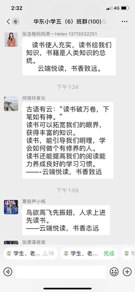 恰逢今天是五、六年級(jí)學(xué)生返校,于是本次活動(dòng)分線下和線上釘釘直播兩部分進(jìn)行。首先,由龍家怡老師向五、六年級(jí)全體師生介紹本次活動(dòng)的意義和介紹讀書節(jié)啟動(dòng)儀式活動(dòng)流程。其次,由葉麗燕副校長(zhǎng)詳細(xì)解讀本學(xué)期讀書節(jié)活動(dòng)方案。然后,學(xué)生們觀看讀書節(jié)啟動(dòng)儀式視頻并撰寫觀后感。一到四年級(jí)的讀書節(jié)啟動(dòng)儀式在釘釘班群上也同時(shí)進(jìn)行。班主任通過(guò)直播向?qū)W生、家長(zhǎng)介紹了本次云端讀書節(jié)活動(dòng),對(duì)學(xué)生的閱讀方法進(jìn)行指導(dǎo)后,觀看讀書節(jié)啟動(dòng)儀式視頻。視頻中,龍江鎮(zhèn)教育局教研專干陳金梅、龍江鎮(zhèn)教育局德育專干和專職責(zé)任督學(xué)劉自力、李耀宗校長(zhǎng)、各行政干部、骨干教師代表、家長(zhǎng)和學(xué)生代表通過(guò)引用關(guān)于“讀書”的名人名言,號(hào)召全體師生多讀書,讀好書,積極參與到讀書節(jié)的各項(xiàng)活動(dòng)中去。在看完了讀書節(jié)啟動(dòng)儀式視頻后,同學(xué)和家長(zhǎng)紛紛表示:視頻拍得太好了,讓人深深陶醉在書香中。六(4)班彭誠(chéng)真同學(xué)在觀后感里面寫到:書籍,可以滋養(yǎng)我們的靈魂。讓我們與書相伴,幸福成長(zhǎng)。二(6)班劉雅婷家長(zhǎng)說(shuō):為華東小學(xué)的讀書節(jié)點(diǎn)贊!讓讀書成為一種時(shí)尚,讓學(xué)習(xí)成為一種習(xí)慣。讀萬(wàn)卷書,行萬(wàn)里路!