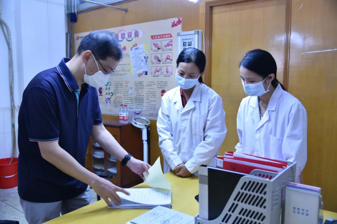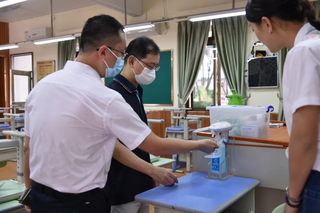 陳宇瑩書記一行先后對我校進(jìn)校測溫點、防控物資儲備室、課室、校醫(yī)室、飯?zhí)?、宿舍等學(xué)習(xí)、生活場所進(jìn)行了重點檢查,深入了解我校防疫期內(nèi)學(xué)生生病情況跟蹤流程、教室配備的防疫物資情況、宿舍樓裝修進(jìn)度等,并認(rèn)真聽取了曾祥明執(zhí)行校長關(guān)于我校秋季開學(xué)準(zhǔn)備工作及常態(tài)化防控工作開展的匯報。