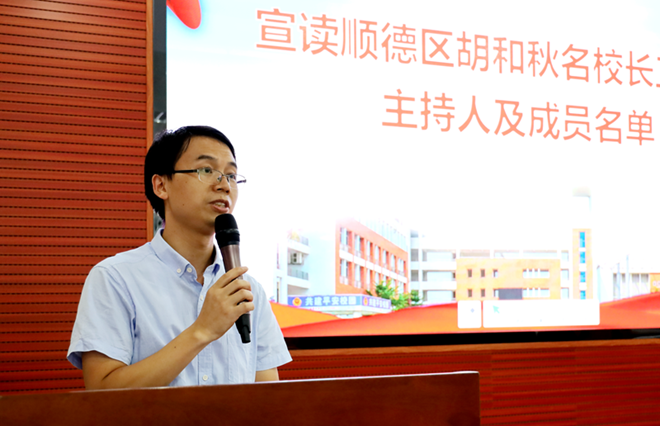 順德區(qū)教育發(fā)展中心教師發(fā)展研究室唐信焱主任宣讀順德區(qū)胡和秋名校長工作室主持人及成員,并向他們頒發(fā)聘書。