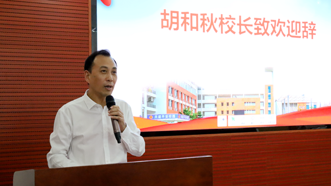 主持人江義中學(xué)黨總支副書記劉啟文介紹了與會(huì)專家、領(lǐng)導(dǎo)和嘉賓后,順德區(qū)胡和秋名校長工作室首席主持人、江義中學(xué)校長胡和秋同志向?qū)<?、領(lǐng)導(dǎo)和嘉賓致歡迎辭。