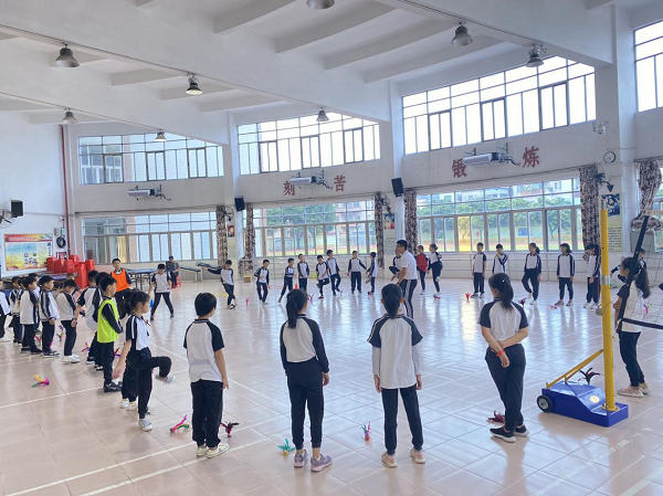 體育方面,田濤老師的授課內(nèi)容是《腳內(nèi)側(cè)踢毽球》,采用學生喜愛的游戲形式進行導入和熱身,充分調(diào)動學生學習的積極性和注意力。本課環(huán)節(jié)設(shè)計合理層層遞進,“手持球接力”“踢球入圈比多”等游戲貫穿課程,帶動起學生們參與課堂的積極性。在練習中以學生為主體,積極引導學生主動思考,創(chuàng)設(shè)小組合作探究解決問題,增加練習組數(shù),讓學生能充分的體驗,真正讓學生體驗到體育帶來的樂趣。