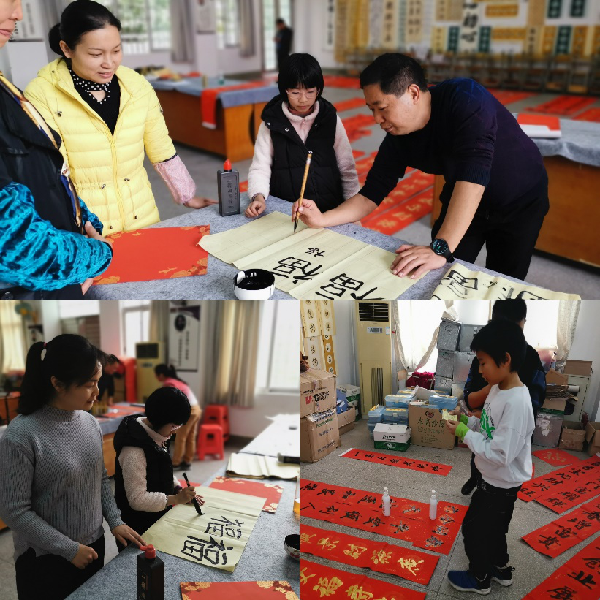 本次活動邀請了韓雨龍、鐘全榮、李華、王海平、鄧富華、劉建華等具有書法特長的黨員教師揮毫潑墨、送福迎新。工會委員提前精心準備了對仗工整、精煉喜慶的春聯(lián)集錦,供全校教職工選擇。