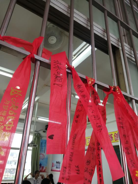 君中是一個(gè)很有愛的大家庭,奮斗的路上,我們從來都不會(huì)寂寞。同學(xué)們?cè)诩t絲帶上寫上對(duì)自己最想鼓勵(lì)的一位同學(xué)的祝福并親手送給對(duì)方,收到祝福的同學(xué)把紅絲帶系到走廊窗戶上。慢慢地,初三級(jí)的走廊就變成紅色的海洋,微風(fēng)不時(shí)吹過,撩動(dòng)的是少年的心……放眼望去,還發(fā)現(xiàn)年級(jí)走廊的移動(dòng)黑板展示著2019屆君蘭中學(xué)卓越班送給2020屆君蘭初三學(xué)子的祝福――《奔涌吧,后浪!》!