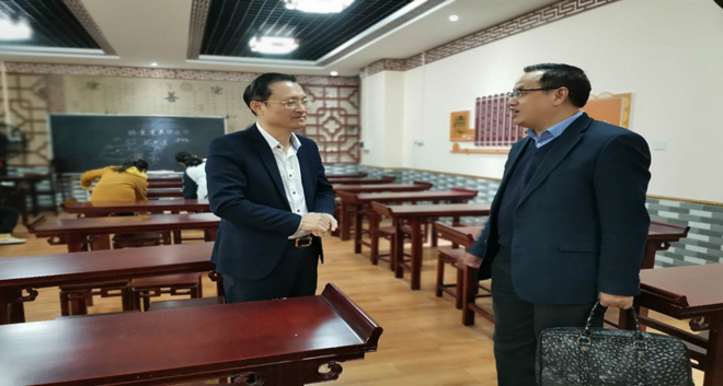 在實(shí)地考察和深入課堂聽(tīng)課指導(dǎo)后,王建春和我校全體領(lǐng)導(dǎo)、部分骨干老師在行政會(huì)議室舉行了座談會(huì)。