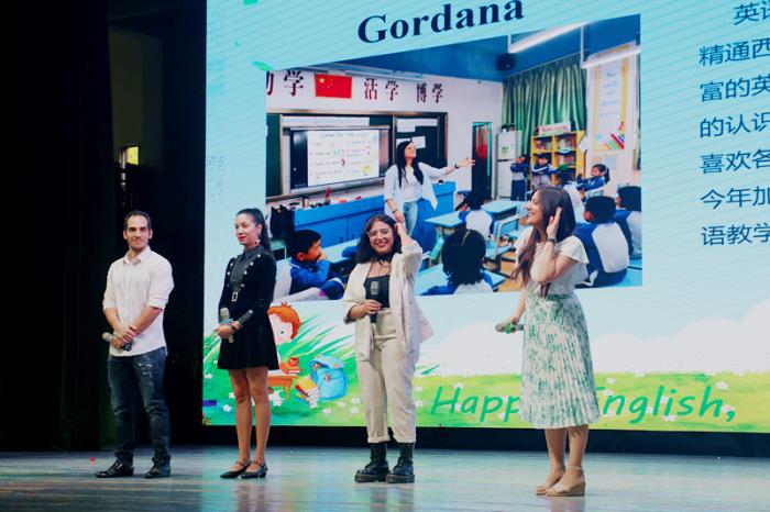 表演結(jié)束后,深受學(xué)生喜愛的Jerry、Zoe、Hafsa、Gordana四位外教老師上臺與同學(xué)們互動,他們熱情地打招呼,現(xiàn)場歡呼聲不斷。在外教老師的帶領(lǐng)下,全體師生演唱英語歌曲“Na Na Na”,合著音樂的節(jié)奏,臺下同學(xué)們熱情高漲,或擊打節(jié)拍,或揮舞手臂,現(xiàn)場的氣氛被點(diǎn)燃。