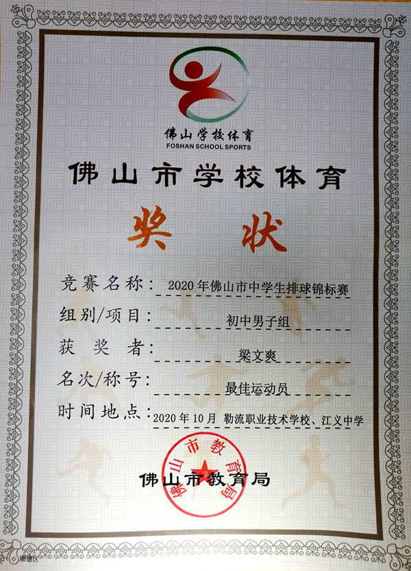 2020年10月30日至11月1日,由佛山市教育局主辦,順德區(qū)教育局承辦,順德區(qū)勒流江義中學(xué)和順德區(qū)勒流職業(yè)技術(shù)學(xué)校協(xié)辦的2020年佛山市中學(xué)生排球錦標(biāo)賽圓滿落下帷幕,來自全市五區(qū)和市直屬學(xué)校共21支球隊(duì)248名運(yùn)動(dòng)員齊聚勒流。江義中學(xué)男子排球隊(duì)代表順德區(qū)初中男子組參賽,經(jīng)過3天的比賽,憑借主場(chǎng)優(yōu)勢(shì),再次蟬聯(lián)佛山市中學(xué)生排球錦標(biāo)賽初中組冠軍,實(shí)現(xiàn)五連冠。梁文爽同學(xué)評(píng)為最佳運(yùn)動(dòng)員,伍劍華老師評(píng)為優(yōu)秀體育指導(dǎo)老師。
