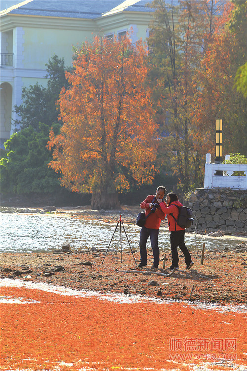 游客和攝影愛好者在仙泉酒店對開湖邊拍攝與欣賞水杉美景。